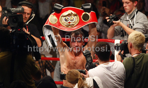 : Dejan Zavec of Slovenia and Rafal Jackiewicz of Poland during IBF World Championship boxing match. IBF World Championship boxing match between Zavec and Jackiewicz was held on 4th of September 2010 in Stozice Arena in Ljubljana, Slovenia.