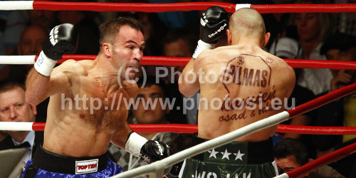 : Dejan Zavec of Slovenia and Rafal Jackiewicz of Poland during IBF World Championship boxing match. IBF World Championship boxing match between Zavec and Jackiewicz was held on 4th of September 2010 in Stozice Arena in Ljubljana, Slovenia.