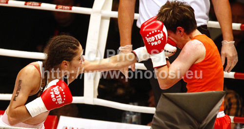 : Tjasa Kolar of Slovenia and Anika Kurzer of Germany during boxing match. Boxing match between Kolar and Kurzer was held on 4th of September 2010 in Stozice Arena in Ljubljana, Slovenia.