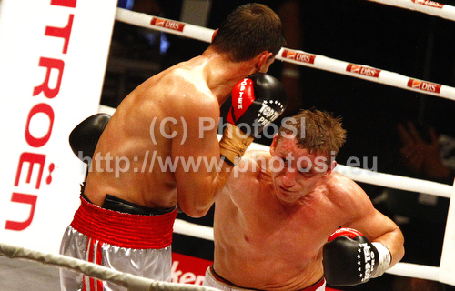 : Denis Simcic of Slovenia and Istvan Varga of Romunia during WBF International boxing match. WBF International boxing match between Simcic and Varga was held on 4th of September 2010 in Stozice Arena in Ljubljana, Slovenia.