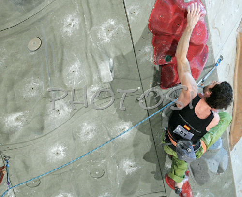 : Third placed Patxi Usobiaga Lakunza of Spain climbing during men finals of last IFSC Sport Climbing World cup of 2008 season. Final race of IFSC Sport Climbing World Cup of 2008 season was held in Kranj, Slovenia on 16th of November 2008.