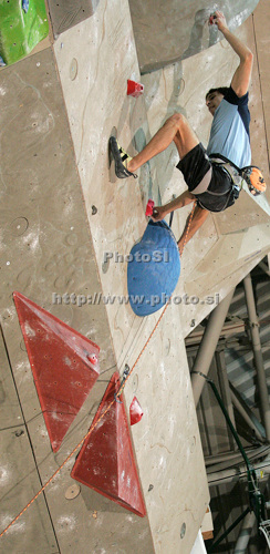 : Klemen Becan of Slovenia climbing during men finals of last IFSC Sport Climbing World cup of 2009 season. Final race of IFSC Sport Climbing World Cup of 2009 season was held in Kranj, Slovenia on 15th of November 2009.