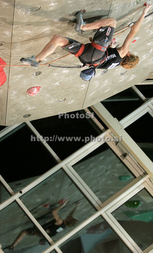 : Third placed Jakob Schubert of Austria climbing during men finals of last IFSC Sport Climbing World cup of 2009 season. Final race of IFSC Sport Climbing World Cup of 2009 season was held in Kranj, Slovenia on 15th of November 2009.