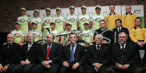 : Team of Perutnina Ptuj (sitting from L to R) Joco Tarbuk, Tone Ceh, dr. Roman Glaser, Milan Cus, Rene Glavnik and Miran Korosec, (second line from L to R) Kristijan Fajt, Andrej Omulec, Matej Stare, Matej Marin, Kristijan Djurasek, Srecko Glivar, Samo Glavnik and Bostjan Pihler, (standing from L to R) Luka Rakusa, Jure Kocjan, Gregor Gazvoda, Mitja Mahoric, Radoslav Rogina, Kristijan Koren, Matija Kvasina, Miran Kelner and Dusan Kovacic at presentation of cycling team Perutnina Ptuj for season 2008 was held in Grand hotel Primus, Terme Ptuj on 30th of January, 2008