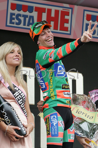 : Winner of the stage Emanuele Sella (Italy) of CSF Group Navigare at podium of 15th stage of Giro d Italia, from Arabba to Passo Fedaia / Marmolada - Dolomiti Stars (153 km). 15th stage was held on 25th of May 2008.