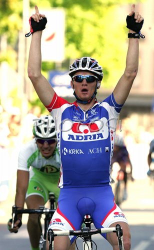 : Winner Grega Bole of Adria Mobil celebrating his victory when crossing finish line of 41st Grand Prix Kranj, Filip Majcen Memorial cycle race. 41st Grand Prix Kranj was held in Kranj, Slovenia, on 31st of May 2008.