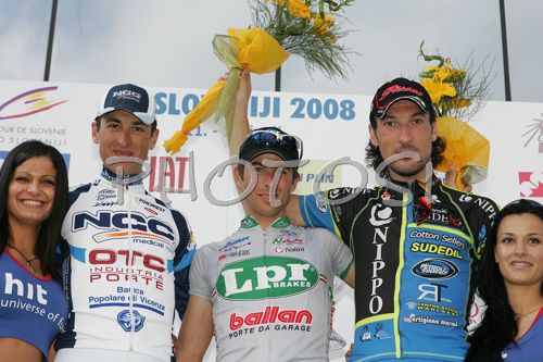 : From L to R: second placed Enrico Rossi of Italia (NGC Medical - OTC Indutria Porte), winner Claudio Cucinotta of Italia (LPR Brakes) and third placed Simone Cadamuro of Italia (Nippo - Endeka) during 1st stage from Ljubljana to Postojna (161 km) of the 15th Tour de Slovenie. The race was held on 11th of June, 2008.