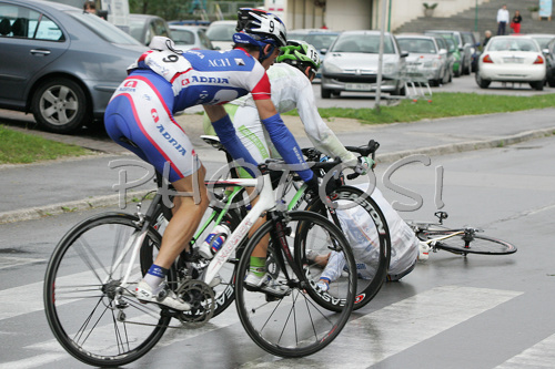 : Fall of Nazareno Rossi of Switzerland (Serramenti PVC Diqugiovanni -Androni Giocattoli) behind him Kristjan Durasek of Croatia (Perutnina Ptuj) and Jure Zagar of Slovenia (Adria Mobil) during 3rd stage from Skofja Loka to Krvavec (110 km) of the 15th Tour de Slovenie. The race was held on 13th of June, 2008.