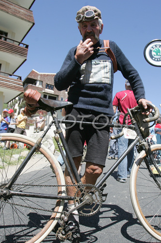 : Cyclist with equipment as it was in the past at the finish of the 17th stage from Embrun to L Alpe-d Huez of Tour de France. The stage was held on 23rd of July, 2008 and it was 210,5 km long.