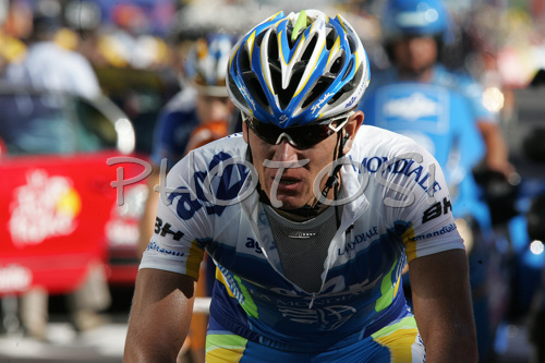 : Sixth placed Vladimir Efimkin (Rus, AG2R La Mondiale) at the finish of the 17th stage from Embrun to L Alpe-d Huez of Tour de France. The stage was held on 23rd of July, 2008 and it was 210,5 km long.