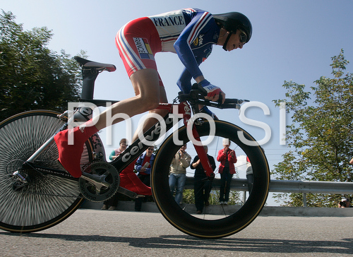 : Edwige Pitel of France riding during Women elite time trial race of UCI Road Cycling World Championships in Varese, Italy. Women elite time trial of UCI Road cycling World Championships was held in Varese, Italy, on Wednesday 24th of September 2008.