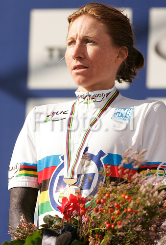 : Winner Amber Neben of USA celebrating her medal won in Women elite time trial race of UCI Road Cycling World Championships in Varese, Italy. Women elite time trial of UCI Road cycling World Championships was held in Varese, Italy, on Wednesday 24th of September 2008.