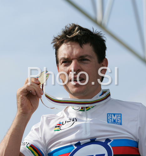 : Winner Bert Grabsch of Germany celebrating his medal won in Men elite time trial race of UCI Road Cycling World Championships in Varese, Italy. Men elite time trial of UCI Road cycling World Championships was held in Varese, Italy, on Thursday 25th of September 2008.