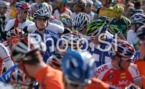 : Matti Helminen of Finland (L) and Kjell Carlstrom of Finland (R) on start of Men elite road race of UCI Road Cycling World Championships in Varese, Italy. Men Elite road race of UCI Road cycling World Championships was held in Varese, Italy, on Sunday 28th of September 2008.
