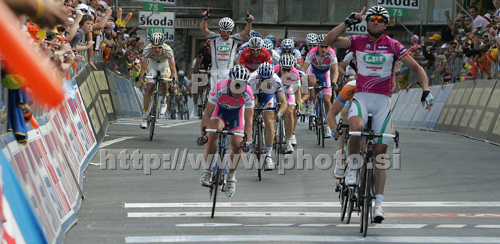 Grado ,Italy - 11.05.2009 : Winner Alessandro Petacchi of Italy (LPR Brakes - Farnese Vini) celebrates when crossing finish line of third stage of 92nd Giro d Italia. Third stage of 92nd Giro d Italia in length of 198km was held on 11th of May 2009, and was leading riders from Grado, Italy, to Valdobbiadene, Italy. Photo by: Mitja Smid Bricelj/PhotoSI
