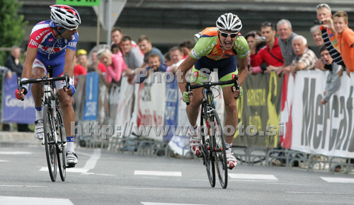 : Winner Gasper Svab of Slovenia (Sava Kranj) at the finish of 42. Grand prix Kranj / Memorial of Filip Majcen. The race was 160 km long and was held on Saturday, 30th of May 2009, in Kranj, Slovenia.