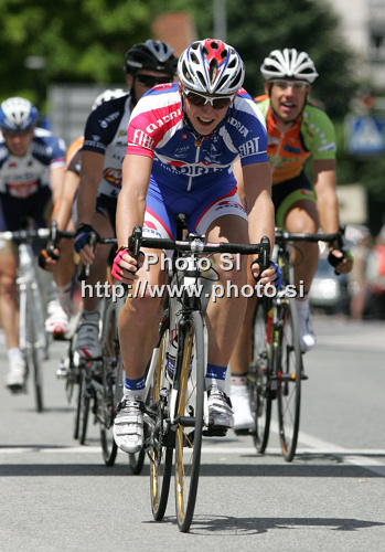 : Third placed Marko Kump of Slovenia (Adria Mobil) at the finish of category Elite / U23 at the circuit race Kranj (Po ulicah Kranja). The race was 78 km long and was held on Sunday, 31th of may, 2009.