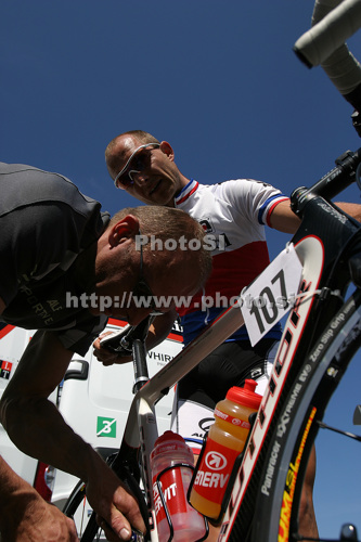 : Petr Bencik of Czech (PSK Whirlpool - Author)with mechanic are preparing bike for race at the start of first stage of Tour de Slovenie 2009 from Koper, Slovenia to Villach (Austria). The first stage was 229 km long and it was held on Thursday, 18th of June, 2009.