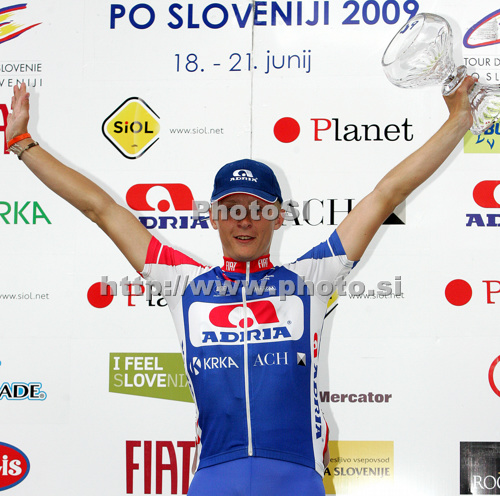 : Winner of the stage Marko Kump of Slovenia (Adria Mobil) at the flower ceremony of the fourth stage of Tour de Slovenie 2009 from Sentjernej to Novo mesto. The fourth stage was 153 km long and it was held on Sunday, 21st of June, 2009.