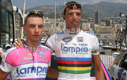: Simon Spilak of Slovenia (Lampre NGC) and Alessandro Ballan (Ita) (Lampre NGC) in jersey of world champion before the start of second stage of Tour de France from Monaco to Brignoles (187 km). The second stage was held on Sunday, 5th of July.