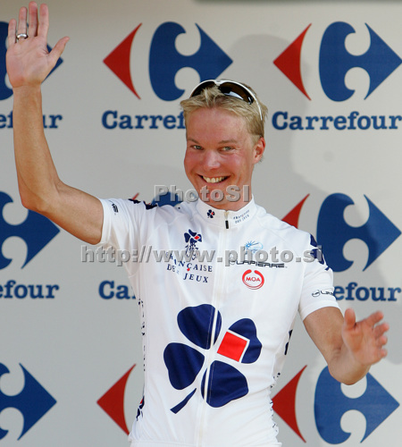 Brignoles ,France - 05.07.2009 : Jussi Veikkanen of Finland (Francaise des Jeux) in polka dot jersey as the best rider in mountain classification at the flower ceremony of the second stage of Tour de France from Monaco to Brignoles (187 km). The second stage was held on Sunday, 5th of July.