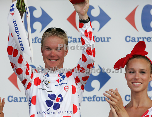: Jussi Veikkanen of Finland (Francaise des Jeux) in polka dot jersey as the best rider in mountain classification at the flower ceremony of the third stage of Tour de France from Marseille to Le Grande Motte (196,5 km). The third stage was held on Monday, 6th of July.
