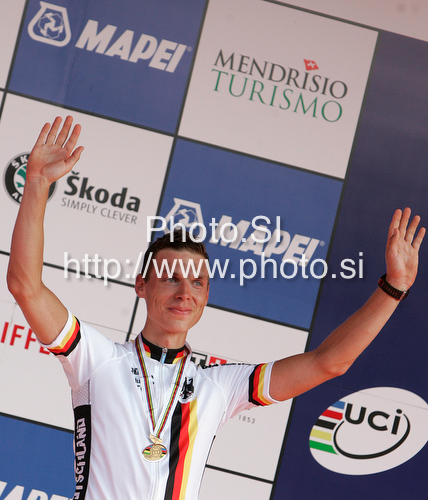 : Third placed Tony Martin of Germany celebrates his medal won in Men Elite UCI Road cycling World Championships time trial race in Mendrisio, Switzerland. 49.8km long Men Elite time trial race was held in Mendrisio, Switzerland, on 24th of September 2009.