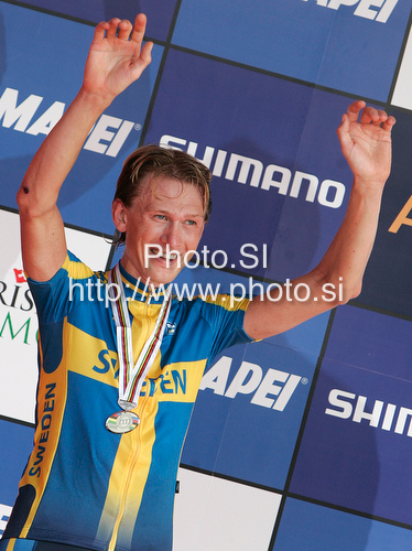 : Second placed Gustav Larsson of Sweden celebrates his medal won in Men Elite UCI Road cycling World Championships time trial race in Mendrisio, Switzerland. 49.8km long Men Elite time trial race was held in Mendrisio, Switzerland, on 24th of September 2009.
