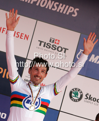 : Winner Fabian Cancellara of Switzerland celebrates his medal won in Men Elite UCI Road cycling World Championships time trial race in Mendrisio, Switzerland. 49.8km long Men Elite time trial race was held in Mendrisio, Switzerland, on 24th of September 2009.