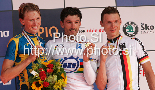 : Winner Fabian Cancellara of Switzerland (M), second placed Gustav Larsson of Sweden (L), and third placed Tony Martin of Germany (R) celebrate their medals won in Men Elite UCI Road cycling World Championships time trial race in Mendrisio, Switzerland. 49.8km long Men Elite time trial race was held in Mendrisio, Switzerland, on 24th of September 2009.