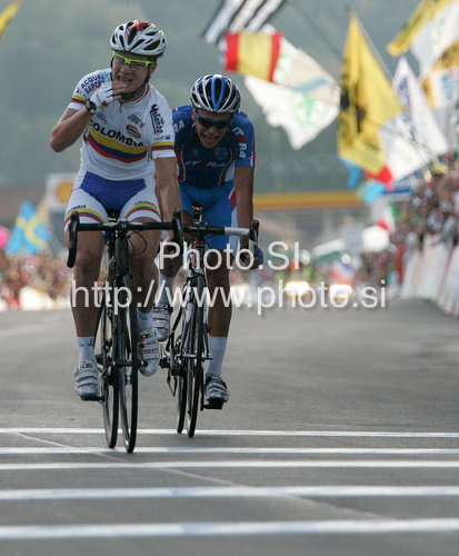 : Second placed Betancur Gomez Carlos Alberto of Colombia celebrating his medal when crossing finish line of Men U23 UCI Road cycling World Championships road race in Mendrisio, Switzerland. 179.4km long Men U23 road race was held in Mendrisio, Switzerland, on 26th of September 2009.