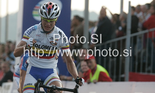 Mendrisio ,Switzerland - 25.09.2009 : Second placed Betancur Gomez Carlos Alberto of Colombia celebrating his medal when crossing finish line of Men U23 UCI Road cycling World Championships road race in Mendrisio, Switzerland. 179.4km long Men U23 road race was held in Mendrisio, Switzerland, on 26th of September 2009. Photo by: Primoz Jeroncic