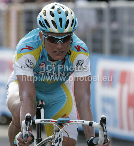 : Fifth placed Alexandre Vinokurov of Kazakhstan (Astana) finishing the 14th stage of Giro d Italia from Ferrara to Asolo. The stage was 205 km long. The 14th stage of Giro d Italia 2010 from Ferrara to Asolo was held on Saturday, 22nd of May 2010 in Italy.