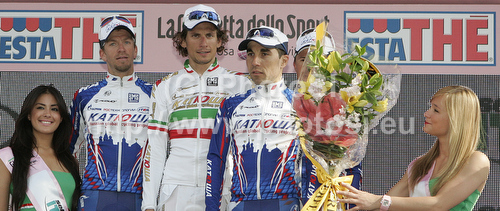 : The best team of the stage in general classification Team Katusha with Fillippo Pozzato in jersey of Italian national champion (in the middle) at flower ceremony of the 14th stage of Giro d Italia from Ferrara to Asolo. The stage was 205 km long. The 14th stage of Giro d Italia 2010 from Ferrara to Asolo was held on Saturday, 22nd of May 2010 in Italy.