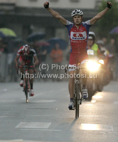 : Winner Matej Gnezda of Slovenia (Adria Mobil) finishing the race for 43. Grand prix Kranj - Memorial of Filip Majcen. The race was 177,3 km long and it was held on 29th of May, 2010 in Kranj, Slovenija.
