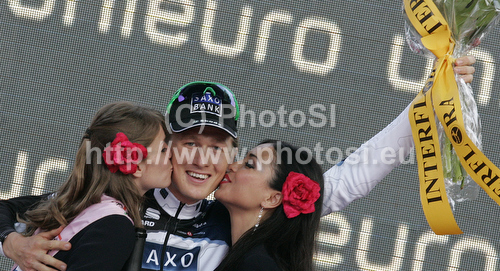 Verona ,Italy - 30.05.2010 : Winner of the stage Gustav Erik Larsson of Sweden (Team Saxo Bank) at the flower ceremony of the individual time trial of the final 21st stage of Giro dItalia at Verona. The individual time trial was 15 km long. The final 21st stage of Giro dItalia 2010 at Verona was held on Sunday, 30th of May 2010 in Italy. Photo by: Mitja Smid Bricelj/PhotoSI