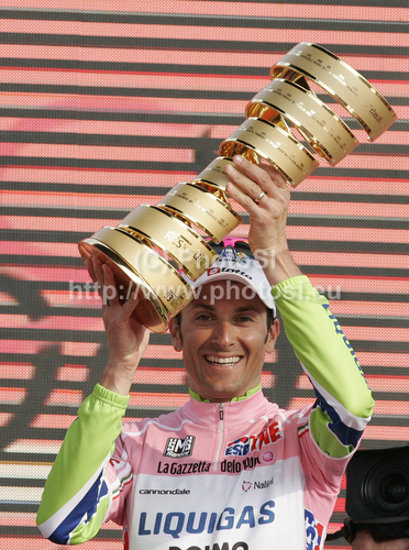 : Winner of the Giro di Italia 2010 Ivan Basso of Italy (Liquigas Doimo) at the flower ceremony of the individual time trial of the final 21st stage of Giro dItalia at Verona. The individual time trial was 15 km long. The final 21st stage of Giro dItalia 2010 at Verona was held on Sunday, 30th of May 2010 in Italy.