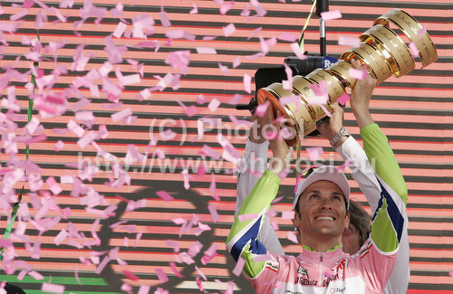 : Winner of the Giro di Italia 2010 Ivan Basso of Italy (Liquigas Doimo) at the flower ceremony of the individual time trial of the final 21st stage of Giro dItalia at Verona. The individual time trial was 15 km long. The final 21st stage of Giro dItalia 2010 at Verona was held on Sunday, 30th of May 2010 in Italy.
