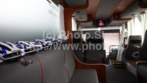 Koper ,Slovenia - 16.06.2010 : Helmets of Lampre NGC riders are ready in their team bus day before first stage of Tour de Slovenie 2010. Teams are getting ready on start of race in Koper, Slovenia, on Wednesday, 16th of June 2010. Photo by: Primoz Jeroncic