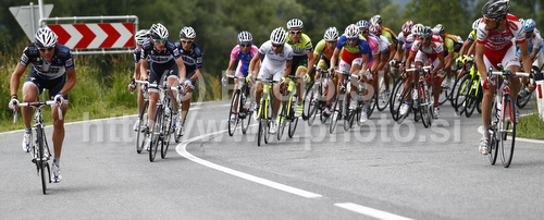 : Riders of Team Saxo Bank during second stage of Tour de Slovenie 2010. Second stage of 18th Tour de Slovenie 2010 in length of 166km was leading cyclists from Ljubljana, Slovenia, to Villach, Austria. First stage was held on Friday, 18th of June 2010.
