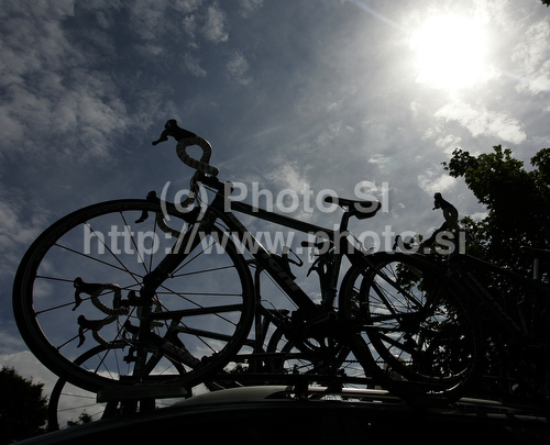 : Spare bikes are ready on roof of team car before third stage of Tour de Slovenie 2010. Third stage of 17th Tour de Slovenie 2010 in length of 171km was leading cyclists from Bled, Slovenia, to Krvavec, Slovenia. Third stage was held on Saturday, 19th of June 2010.