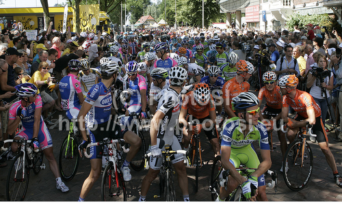 : Peloton before the start of the first stage of the 97th Tour de France from Rotterdam (Netherlands) to Bruxelles (Belgium). The stage was 223,5 km long. The first stage of 97th of Tour de France 2010 from Rotterdam to Bruxelles was held on Sunday, 4th of July 2010 in Netherlands and Belgium.