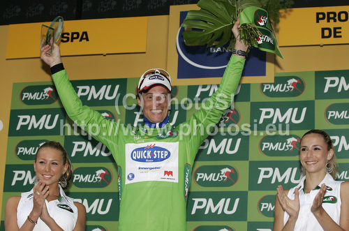: Sylvain Chavanel of France (Quick Step) in green jersey as the best rider in points classification at the flower ceremony of the second stage of the 97th Tour de France from Bruxelles to Spa (Belgium). The stage was 201 km long. The second stage of 97th of Tour de France 2010 from Bruxelles to Spa was held on Monday, 5th of July 2010 in Belgium.