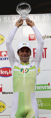 : Winner Robert Vrecer of Slovenia (Team Perutnina Ptuj) at the flower ceremony of the first stage of Tour de Slovenie 2011. The first stage / prologue was 6,6 km long and it was held on Thursday, 16th of June, 2011 in Ljubljana, Slovenia.