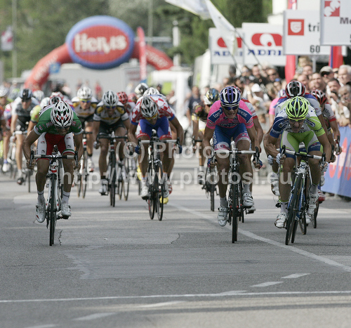: Winner Elia Viviani of Italy (Team Liquigas-Cannondale) on the right, second placed Grega Bole of Slovenia (Team Lampre - ISD) in the middle and third placed Giovanni Visconti of Italy (Team Farnese Vini-Neri Sottoli) riding during the second stage of Tour de Slovenie 2011. The second stage from Koper to Nova Gorica was 189,6 km long and it was held on Friday, 17th of June, 2011 in Slovenia.