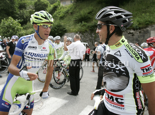 : Vincenzo Nibali of Italy (Team Liquigas-Cannondale) and Carlos Sastre Candil of Spain (Team Geox - TMC) before the start of the third stage of Tour de Slovenie 2011. The third stage from Trzic to Golte was 170,6 km long and it was held on Saturday, 18th of June, 2011 in Slovenia.
