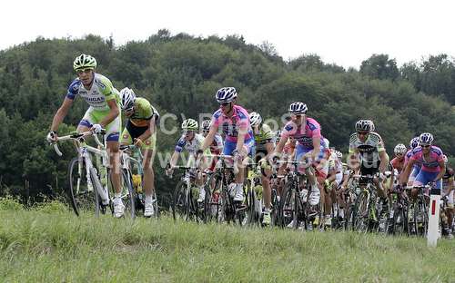 : In front of the peloton Vincenzo Nibali of Italy (Team Liquigas-Cannondale) riding during the third stage of Tour de Slovenie 2011. The third stage from Trzic to Golte was 170,6 km long and it was held on Saturday, 18th of June, 2011 in Slovenia.