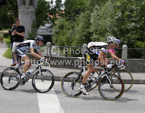 : Laurent Didier of Luxembourg (Team Saxo Bank - Sungard) and Geert Steurs of Belgium (Team Topsport Vlaanderen-Mercator) riding during the third stage of Tour de Slovenie 2011. The third stage from Trzic to Golte was 170,6 km long and it was held on Saturday, 18th of June, 2011 in Slovenia.