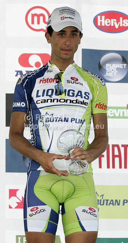 : Third placed Daniele Ratto of Italy (Liquigas Butanplin) at the flower ceremony at the first stage of Tour de Slovenie 2012. The first stage from Celje to Novo mesto was 152 km long and it was held on Thursday, 14th of June, 2012 in Slovenia.