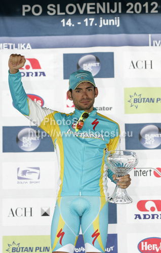 : Winner Simone Ponzi of Italy (Astana Pro Team) at the flower ceremony of the first stage of Tour de Slovenie 2012. The first stage from Celje to Novo mesto was 152 km long and it was held on Thursday, 14th of June, 2012 in Slovenia.
